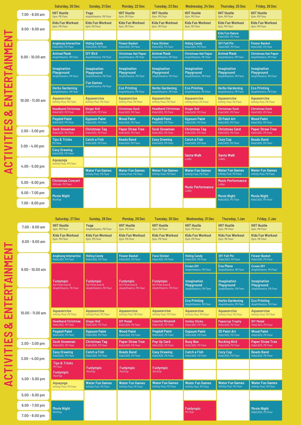 Festive roast, carved meats, seafood selections, local dishes, and Christmas desserts.